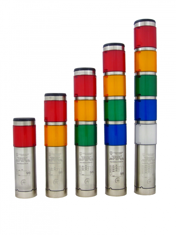 There are [5] sizes currently fitting small to very large machines. Up to [5] colors per unit are supported in any color order and combination of Red, Yellow, Green, Blue, and White. A 6th Color Segment can be realized with our illuminated cap option, which works either stand-alone or with the buzzer on the 251 Command Tower.